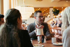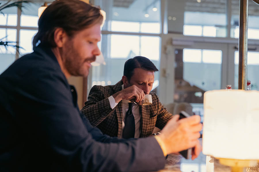 Christian Coachman hinner med en espresso i pausen tillsammans med Niklas Virta från Aqua Dental