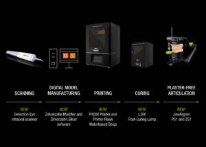 Modellen kan rengöras i ett ultraljudsbad och sedan härdas med härdningslampan L300. Den kan därefter, för att kontrollera patientens käkrörelser, placeras i PS1-artikulatorn eller ZS1 Mini-Arti och tack vare den nya JawAligner PS1 eller ZS1 (magnetiska distansplattor) krävs inget gips.